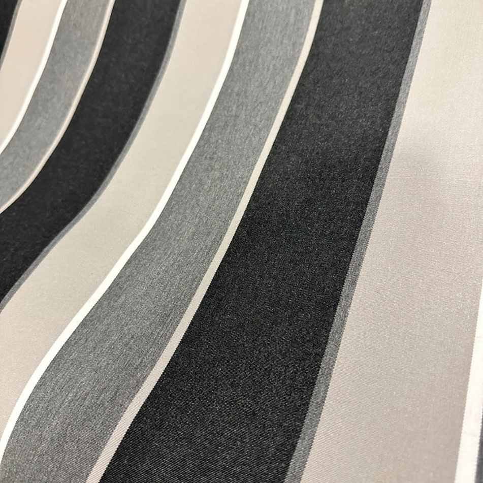Vertical Stripes in shades of black, medium and dark grey with white pinstripes with a 8.95″ repeat